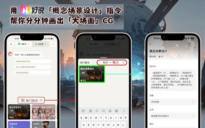 最简单的方式就是操纵 好说 AI 的 “概念场景设想” 指令来一键生成: